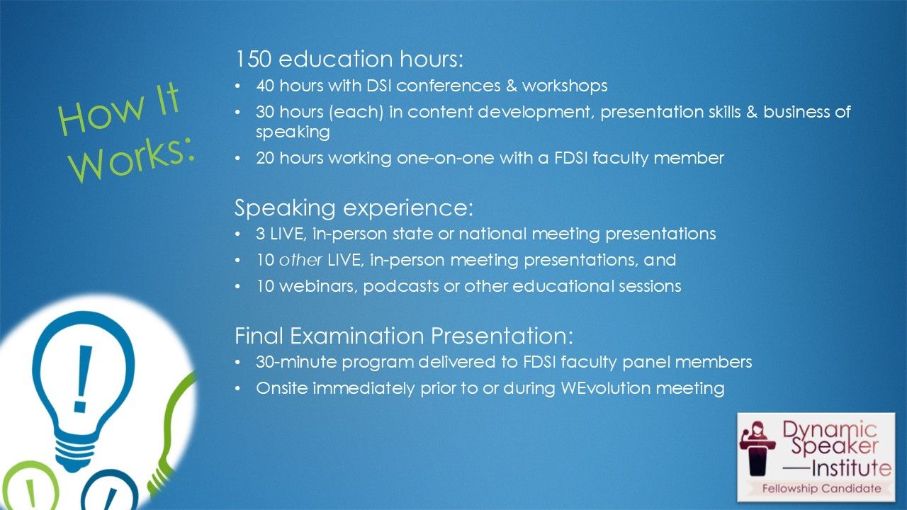 Members may choose to pursue a Fellowship and earn the FDSI professional designation or simply utilize our curriculum to connect with courses and experts who can help the speaker develop in specific areas.